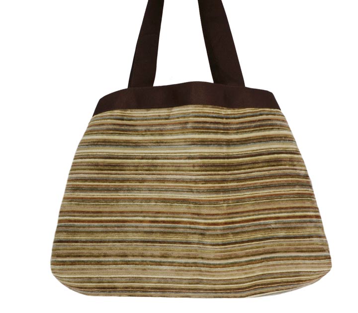 Autumn multi color plush striped fabric grocery bag with brown strap