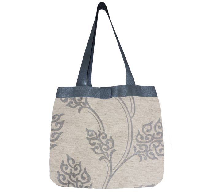 Silver lotus linen color woven fabric grocery bag with dark grey straps